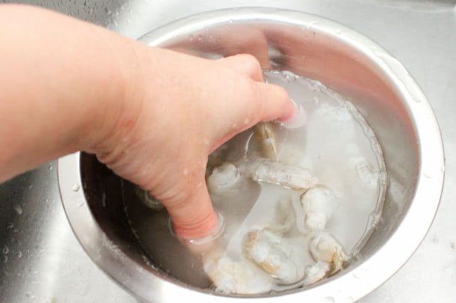 3.エビに塩と片栗粉を加えてよく揉み込んでから、水で2回ほどサッと洗い、水気を拭き取ります。