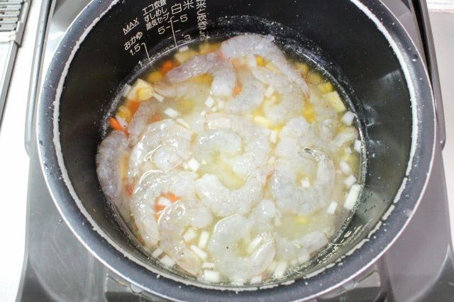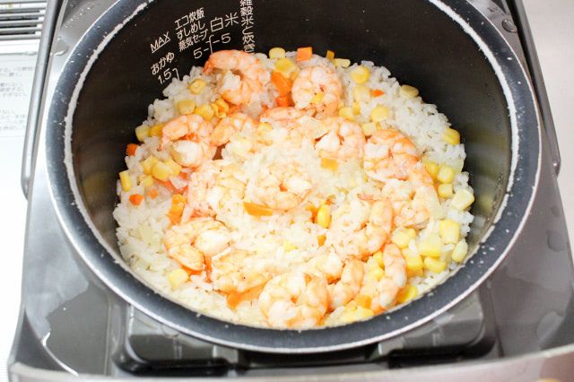 6.玉ねぎ、にんじん、とうもろこしを入れてエビを乗せ、普通モードで炊きます。