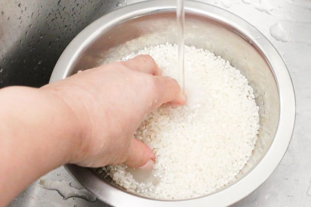 1.お米を流水でサッと洗い、ザルに上げておきます。