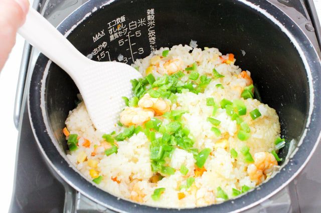 エビはなるべく重ならないように乗せてくださいね。ピーマンは炊飯器で炊くとやわらかくなり過ぎるので、炊き上がった後に加えます。