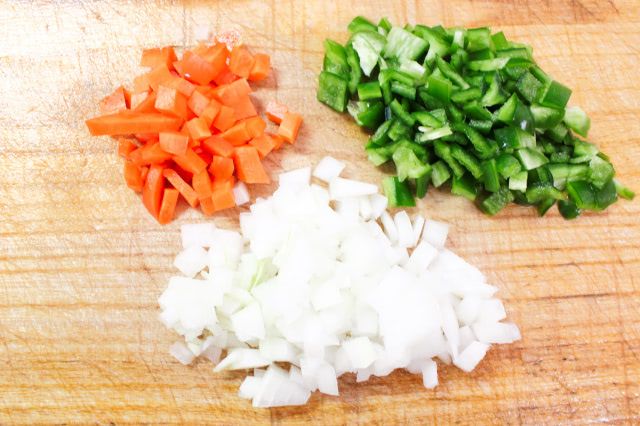 4.玉ねぎ、にんじん、ピーマンをみじん切りにします。