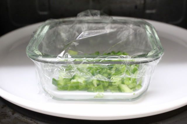 炊飯器のスイッチを入れたら、ピーマンを電子レンジで加熱します。加熱後はラップをかけたまま、ピラフが炊けるまで置いておきます。