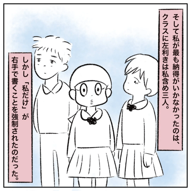 そして、まるさんが最も納得がいかなかったのは、左利きはまるさんを含めクラスに3人いたにもかかわらず、まるさんだけが右手が書くことを強制されたことでした。