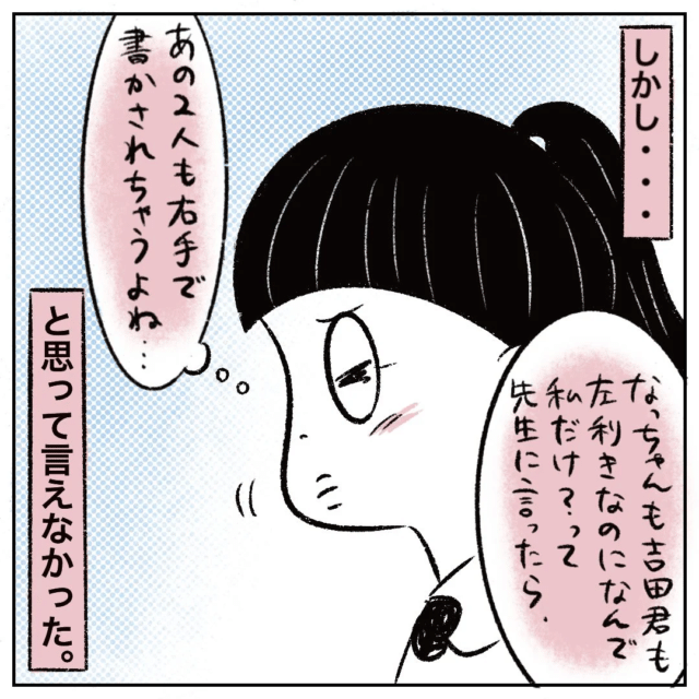 理不尽な先生の対応に納得がいかなかったまるさんですが、「なんで私だけ?」と先生に言えば他の2人も右手で書かされてしまうと思い言えませんでした。