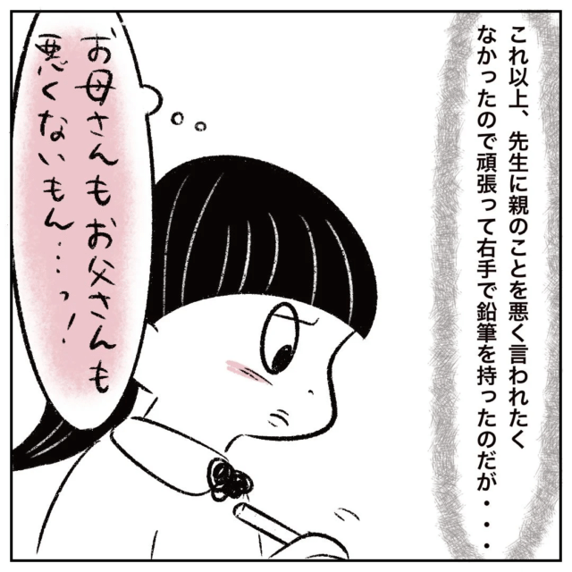 これ以上先生に親のことを悪く言われたくなかったまるさんは、「お母さんもお父さんも悪くないもん・・・っ!」と不慣れな右手で頑張って鉛筆を持ちました。しかし・・・