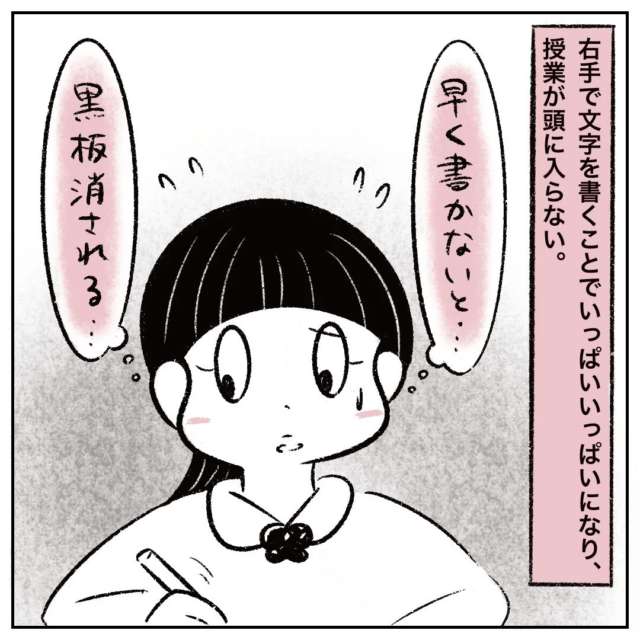 「早く書かないと・・・黒板消される・・・」右手で文字を書くことでいっぱいいっぱいになり、授業が頭に入りません。