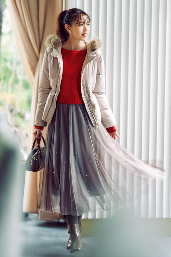 上半身に重厚感が出るダウンには、落ち感のあるスカートで足元の引き算が必要。抜け感を与えるチュール素材でより細見えが加速。