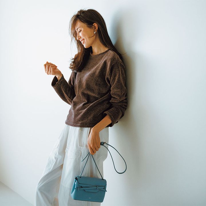 ニット¥17,600(エルド)カーゴパンツ¥26,400(ティッカ)イヤリング¥5,670(アビステ)バッグ¥29,700(TOV/アンソロジー)