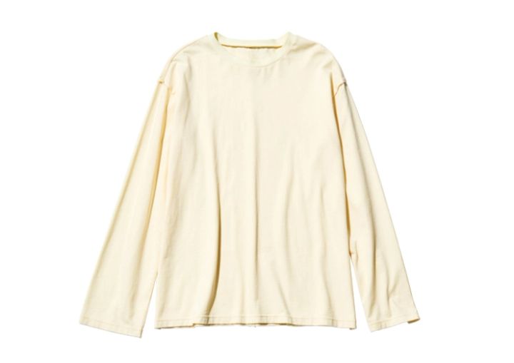 今季トレンドにカムバックしたスウェットは、白のカットソーを仕込んでこなれさせて。チラ見えなのに効果抜群、首まわりが狭く、しっかりした生地がベストです。