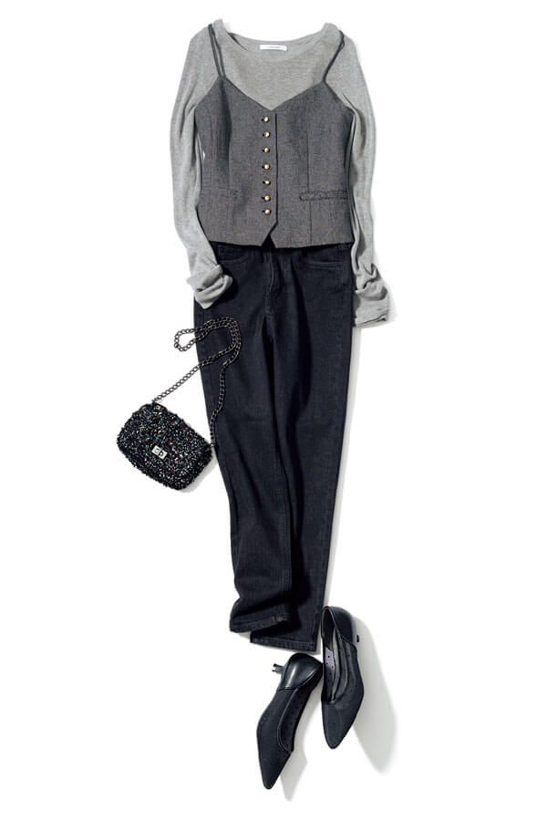 軽く薄手なキャミだと若見え感が出がちなので、厚手の素材を選ぶのが必須。ウールやツイード地のアイテムが、今季はちょうど豊富です♪ フォーマル感ある生地なら子供見えを回避できます。整然と並ぶ金ボタンも、大人っぽさを増すエッセンスに。ブラックデニムを合わせて甘さを削ぎ落とせばさらにクールな印象に。