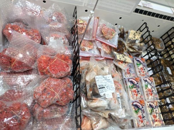 こじんまりとした店内ですが、入り口中央には冷凍庫もあり、蟹・鮭・帆立などの北海道を代表する海産物を販売しています。割れかけ品入りの生食可能な「訳ありほたて 500g」(2000円)はとてもお買い得。「根室産のボイル花咲がに 400g」(1836円)は美しいですね。