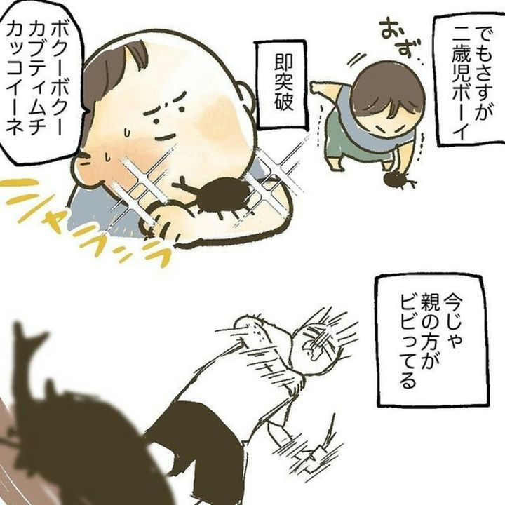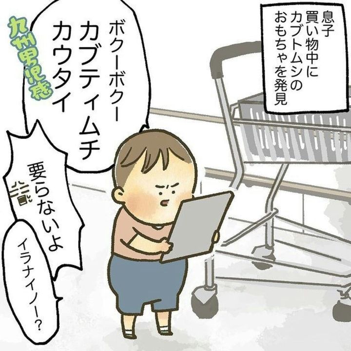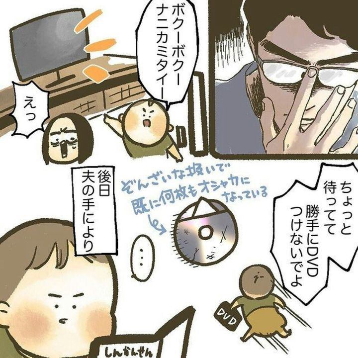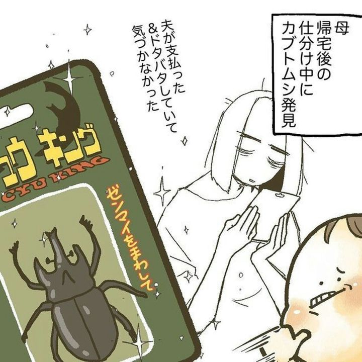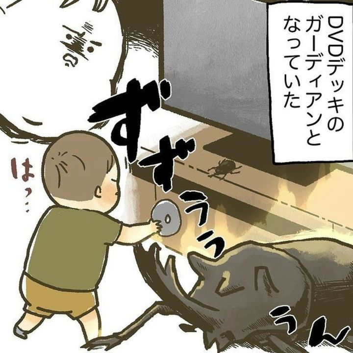 ありこ(@ankoooomochi)さんの息子は買い物中にカブトムシのおもちゃを見つけ「買いたい」と言い、知らない間に夫が支払いを済ませていました。ゼンマイで動くそのおもちゃはねじを回すと「ガシャガシャ」と音を立てるため、あれほど欲しがっていた息子も恐怖の表情に。そして親はその心理を利用し「勝手にDVDを見ようとする息子対策」としてDVDデッキのすぐ上にカブトムシのおもちゃを設置しましたが…?