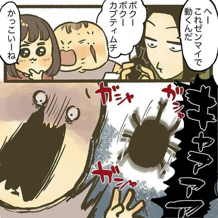 最後の一コマに載っている写真、こんなものが転がる日常は恐ろしいですね。一瞬では本物の虫と見分けがつかないため「ヒャッ」と声を出してしまいそう。