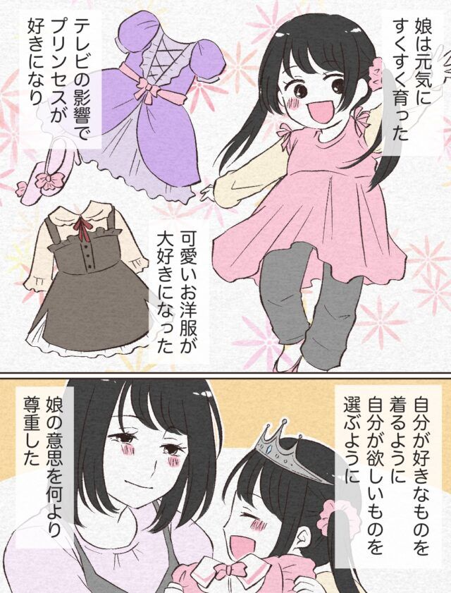 菜乃花ちゃんは元気にすくすく育ちました。テレビの影響でプリンセスが好きになり、可愛いお洋服が大好きになりました。自分が好きなものを着るように、自分が欲しいものを選ぶように、奈々さんは菜乃花ちゃんの意志を何よりも尊重しました。