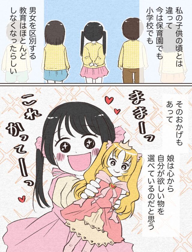 奈々さんの子どもの頃とは違い、保育園でも小学校でも、男女を区別する教育はほとんどしなくなったと言われていますが、そのおかげもあって、菜乃花ちゃんは心から自分が欲しい物を選べている、奈々さんはそう思っていました。