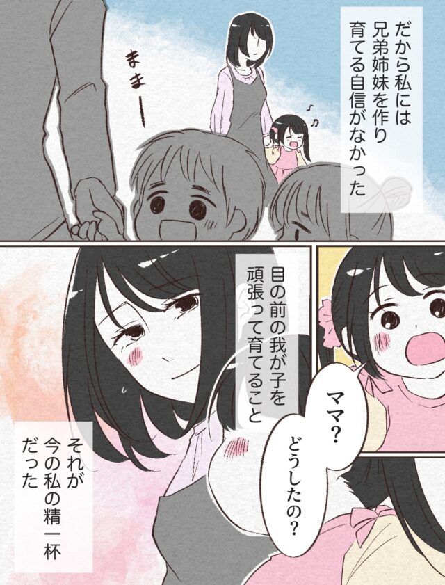 そのことから兄弟姉妹を作って育てる自信がなかった奈々さんは、「目の前の我が子を頑張って育てること」それが、その時の精一杯だと感じていたのでした。