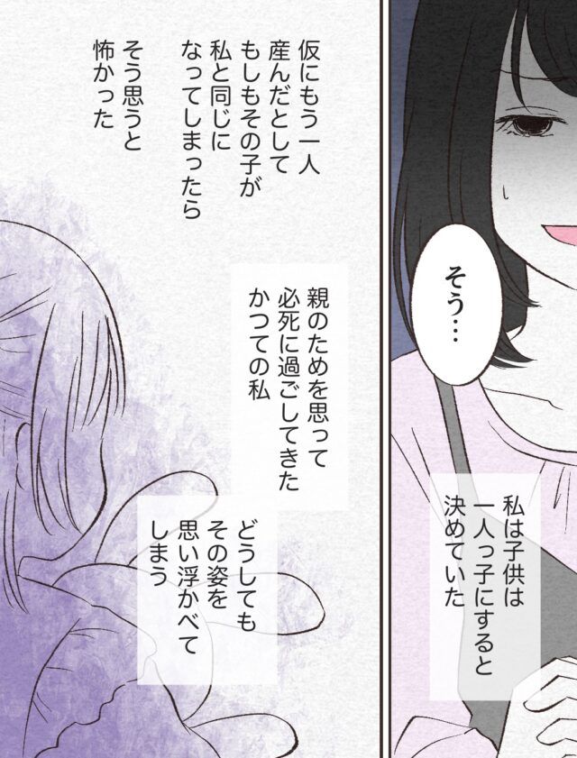 「そう・・」と奈々さんは答えたものの、子どもは一人っ子にすると決めていました。「仮にもう一人産んだとして、もしもその子が私と同じになってしまったら・・」そう考えて怖くなる奈々さんは、親のためを思って必死に過ごしてきたかつての自分を、どうしても思い浮かべてしまうのでした。