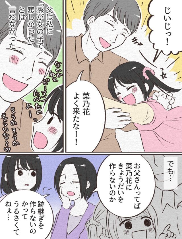 そして、奈々さんが菜乃花ちゃんと一緒に実家に帰ると、「じいじっ!」「菜乃花よく来たな!そう言って嬉しそうに笑うお父さんを見て、奈々さんは「父は私に『孫が女の子で悲しかった』とは言わないんだな」と思いました。でも・・「お父さんってば、『菜乃花にきょうだいを作らないのか』『跡継ぎを作らないのか』ってうるさくてねぇ・・」とお母さんにそう言われ、複雑な気持ちになりました。