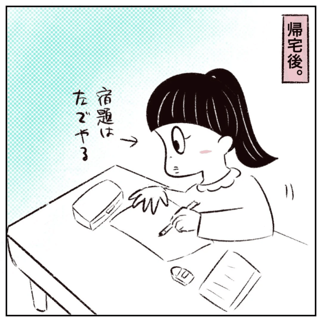 帰宅後、宿題をしていたまるさん。家ではいつも通り左手で書いていました。