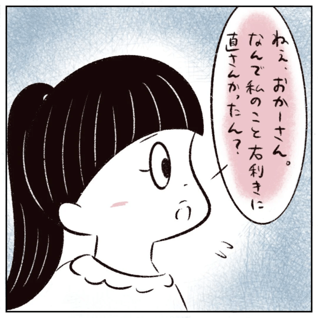 まるさんは「ねぇ、おかーさん。なんで私のこと右利きに直さんかったん?」と聞いてみました。