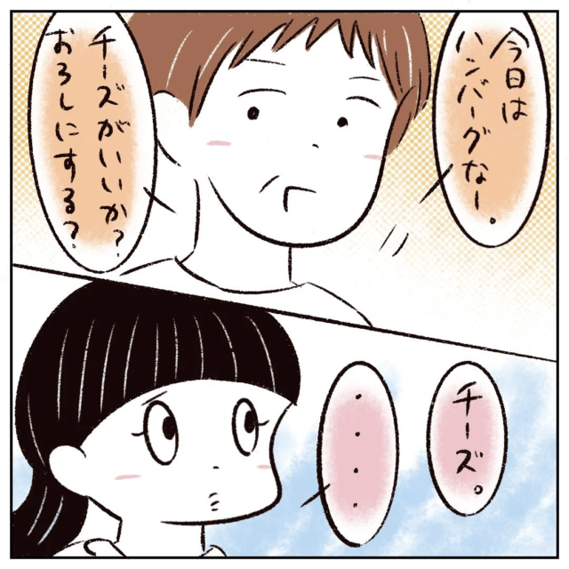 「今日はハンバーグなー。チーズがいいか?おろしにする?」と聞かれ「チーズ」と答えながら何か言いたげなまるさん。