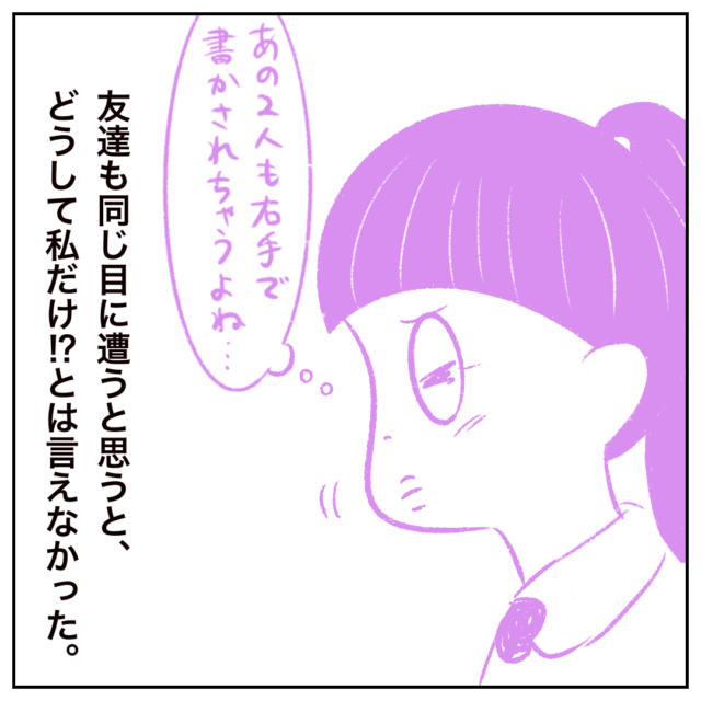 これはまるさんが小学2年生だった数十年前のお話です。先生の間違いを指摘したことできつく当たられるようになったまるさん。左利きなのに右手で書くことを強要され、「非常識な親に育てられた可哀想な子」とひどい言葉を浴びせられました。クラスにいる他の左利きの子には何も言わない先生に納得がいかなかったまるさんですが、言えば他の子も右手で書くことを強要されると思い言えませんでした。