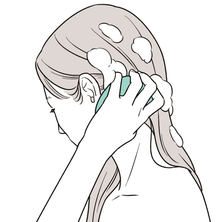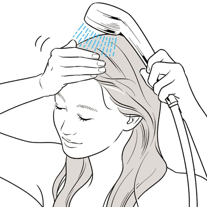 上からシャワーをあてて、お湯をかけながら指で優しくこすって泡と同時に汚れを落としていきます。すすぎ時間も2分間が目安。