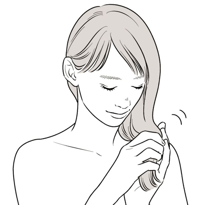 水分を軽くとり、トリートメントを手のひらで広げ毛先から優しく揉み込むように塗布。徐々に上のほうに向かってなじませます。