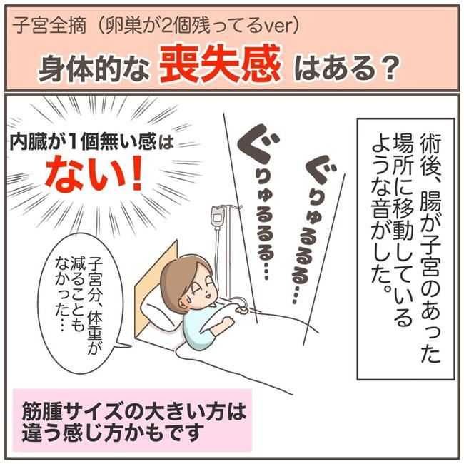 子宮全摘直後から3年たった現在まで幸い喪失感やメンタルの不調を感じることはありません(卵巣が残っていることも影響していると思います)。