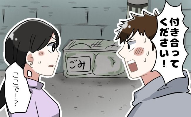 お互いに交流を取るうちに好意を寄せていたことがわかりました。「付き合うか付き合わないか」そんな微妙な関係の時期に飲みに行き、帰り道のこと。「話がある」と彼から言われたのは……なんとゴミ捨て場の前でした。そして「付き合ってほしい」と言われたのです。思わぬシチュエーションでの告白に「ここで言う……!?」と、私は笑ってしまいました。