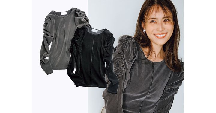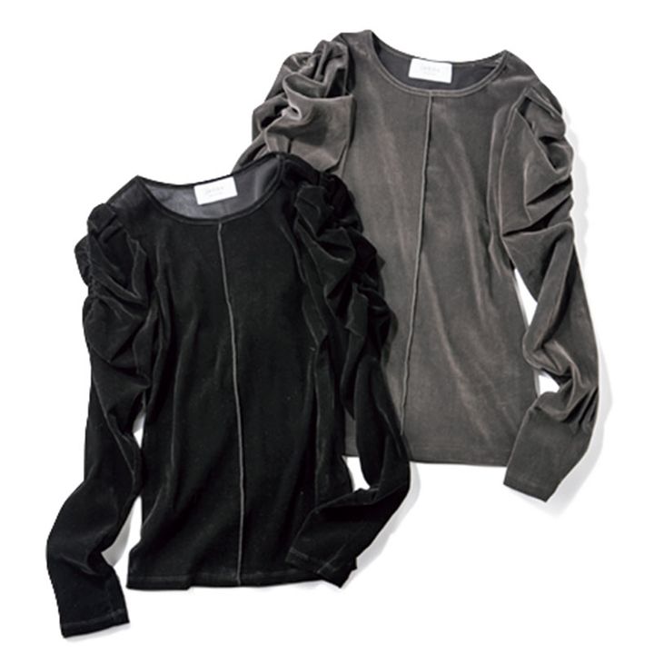 シャーリング加工が施されたパフスリーブが目を引く1着。さらりと軽やかな着心地のベロア生地で春まで長く着られます。
