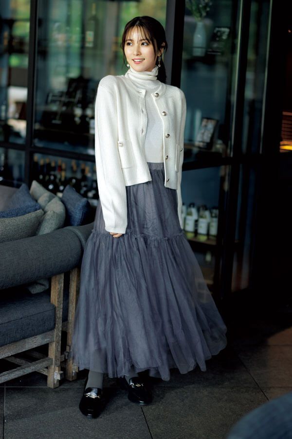 ミラノリブ編みで仕上げた上品なニットジャケットは、厚手のインナーでもしっかり着込めるゆとりのあるサイズ感。フリルギャザーをたっぷりに効かせたチュールスカートで、ふんわり軽やかに華やいで。足元はクラシカルな黒ローファーで引き締めを。