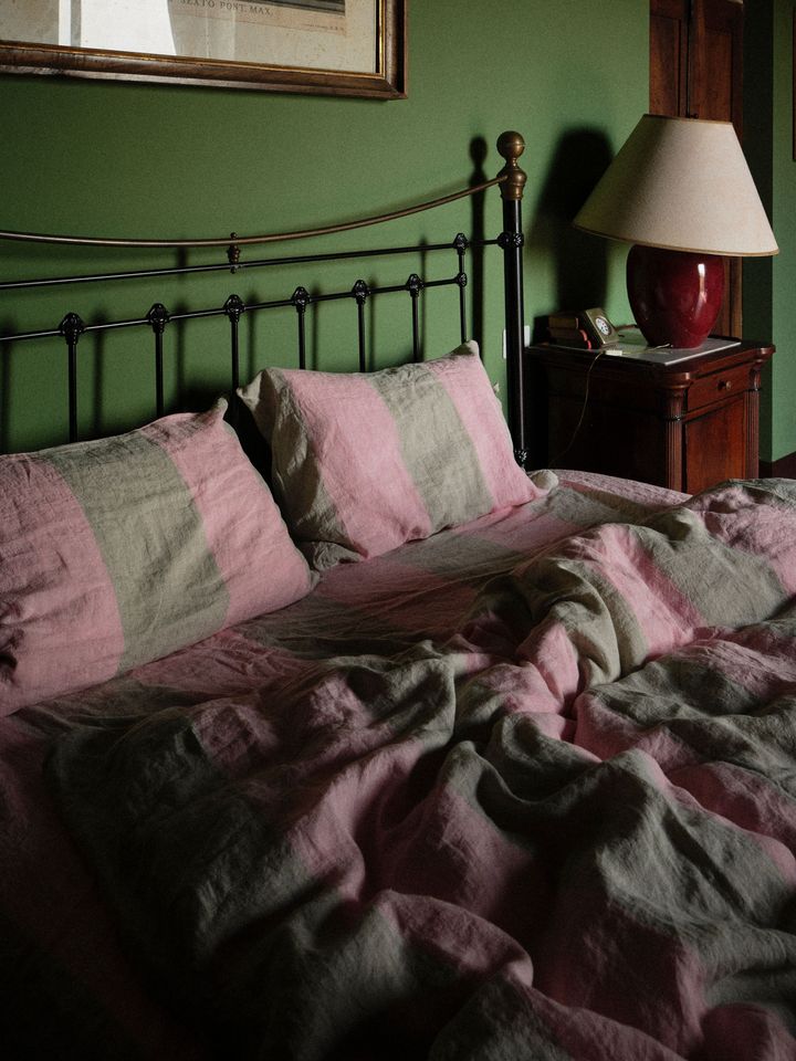 コレクションにはアイボリーやグレーなど、落ち着いた色合いのスタイルもあるが、タンザーとシンプソンは「ベッドはこうあるべき」という既存のイメージを覆したかったのだと話す。「ベッドルームは、素の自分が出せる場所であるべきです。なのに多くの人はある一定の年齢になると、急に個性を押し殺すかのように、シーツなどを白一色といった無難なもので統一し始めます。そのことに気づいて、枕カバーを単品で買えるブランドにしたいと思ったのです。枕カバーの色と柄は全部バラバラでもいいし、布団カバーもまた全然違うものでいい。何でもありなんです。自分が好きなもので揃えればよくて、何も(セットのように)きれいに統一しなければいけないという決まりは、どこにもないのです」