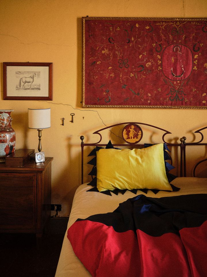 「ローラと私は遠距離恋愛をしていた時期があり、ホテルやベッドリネンの話をするのが、2人の会話で当たり前になっていったのです。『部屋はどんな感じ?』『居心地はどう?』みたいに」とシンプソンは言う。同棲を始め、寝室のコーディネートにとりかかると、既存の家具や寝具では、自分たちの思い描いている空間は作れないことに気づいた。「1つの世界観を作ることに、2人ともやりがいを感じるんです。なので、さまざまな伝統を生かしたブランドにするというアイデアは、ここから生まれたんだと思います。昔ながらの高級品や現代のミニマリズムの上に成り立ったブランドではなく、マキシマリストであらゆる要素を取り入れた、遊び心と安らぎも感じられるブランドにしたかったのです」