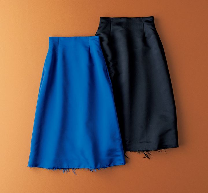 ハリのあるサテンの女性らしいAラインスカート。切りっぱなしの裾が程よいハズシに。スカート(ともにブリル/ブリル新宿)