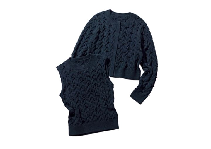 大小の黒パールとケーブル編みの組み合わせで無難さを回避。パール付きニットカーディガン¥16,500、パール付きノースリーブニット¥14,300/ともにアプワイザー・リッシェ