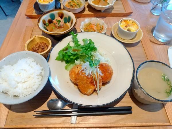 ランチメニューはこれ一択です。 食後の飲み物付きと飲み物とスイーツ付きのどちらかが選べます。 どれもお母さんが家族のために作る料理みたい。素朴ですが身体にやさしくてほっこりする味です。器はどれもおばあちゃんちで使っていたような生活雑器で、懐かしい感じがしました。