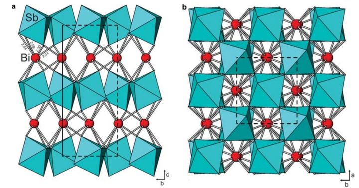 画像のように、「アンチモンと酸素の八面体が形成する市松模様のシート」と「ビスマス」が平行に位置しています。