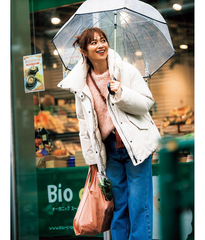 ダウンジャケット¥107,800(ウールリッチ/ウールリッチ 二子玉川店)ニット¥22,000(ウィム ガゼット/ウィム ガゼット 玉川髙島屋S・C店)デニムパンツ¥28,600(アッパーハイツ/ゲストリスト)ベルト¥13,200(レフィエ/フラッパーズ)バッグ¥126,500(J&M デヴィッドソン/J&M デヴィッドソン カスタマーセンター)ピアス¥39,600(リューク)マルシェバッグ¥1,100(ビオセボン/ビオセボン・ジャポン)傘/スタイリスト私物