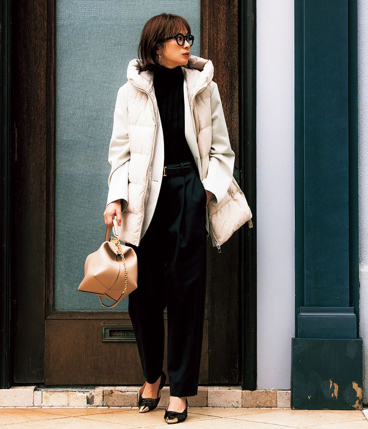 ダウンジャケット(ジレ着回し)¥88,000(デュノ)ニット¥31,900(フィリッポ デ ローレンティス/トヨダトレーディング プレスルーム)ジャケット¥38,500(styling//styling/ ルミネ新宿1店)パンツ¥20,900(エリオポール/エリオポール代官山)ベルト¥20,900[参考価格](アトリエ アンボワーズ/アマン)バッグ¥181,500(ザンケッティ/八木通商)パンプス¥59,400(ネブローニ)メガネ¥47,300(モスコット/モスコット トウキョウ)ピアス¥6,820(エティカ/ZUTTOHOLIC)