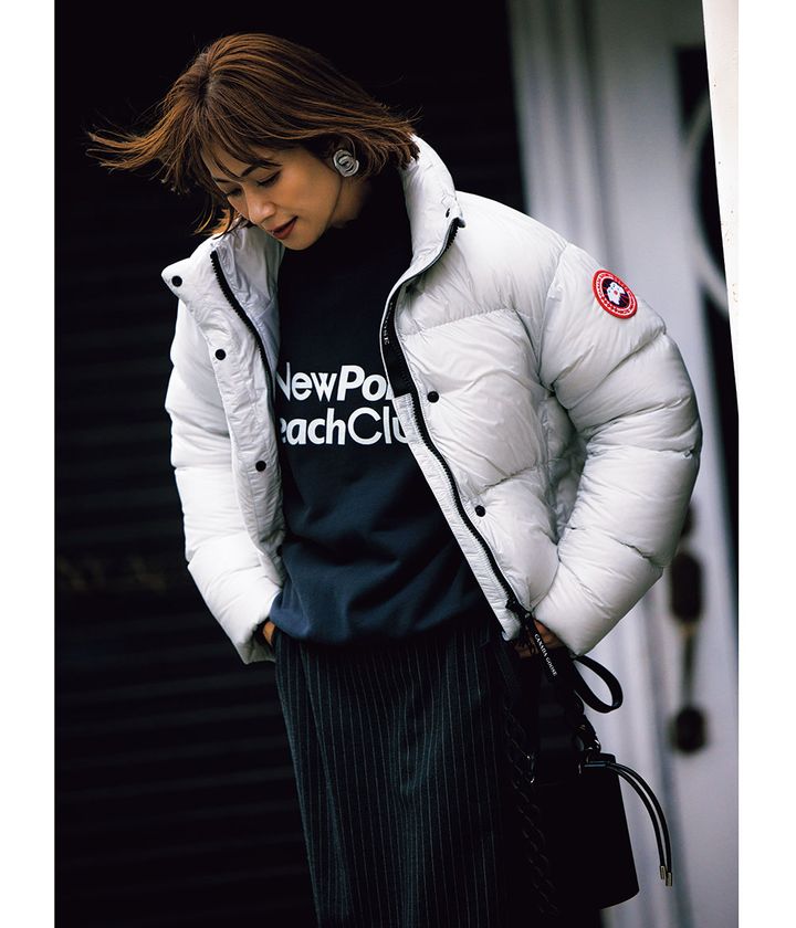 ダウンジャケット¥154,000(カナダグース/カナダグースジャパン)スウェット¥11,000(ビューティー&ユース/ユナイテッドアローズ 渋谷スクランブルスクエア店)ブラウス¥25,300(エーケーワン/ビームス ハウス 丸の内)スカート¥33,000(ドローイング ナンバーズ/ ドローイング ナンバーズ 新宿店)バッグ¥171,600(セルジオ ロッシ/セルジオ ロッシ カスタマーサービス)イヤリング¥7,700(アビステ)
