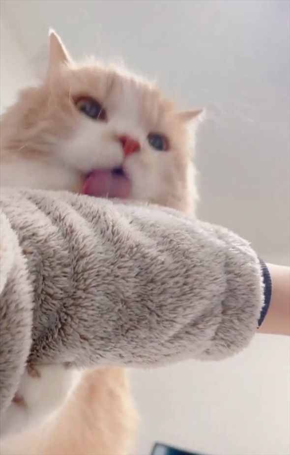 その時、飼い主さんの腕を服越しにペロペロなめていたモグちゃん。