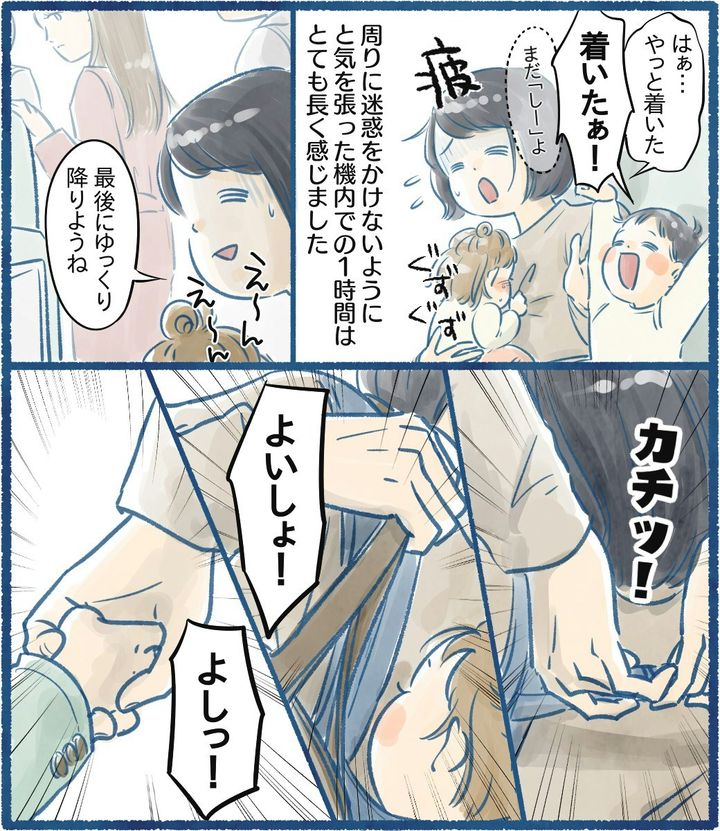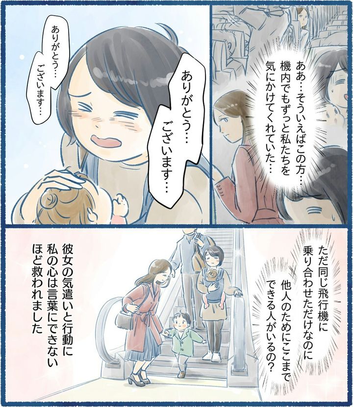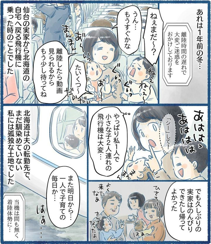 あやさん(仮名)はこの日、仙台の実家から北海道へ戻るため子ども2人を連れて飛行機の中にいました。子連れでの飛行機移動は、子どもが退屈になって騒いでしまいがち。この日もあやさんは2人の子どもに振り回されて疲労困憊のなか、まだ住み慣れていない北海道へ向けて飛び立つのでした。この物語はママリ読者が、子育て中に実際に経験した体験談。育児に追われていっぱいいっぱいの中で触れた、人の優しさのエピソードを漫画化しました。世の中はとてもあたたかい人たちにあふれている。子育てをしていなければ触れることのなかった人の優しさを紹介しつつ、ママリから「ありがとう」を伝えます。