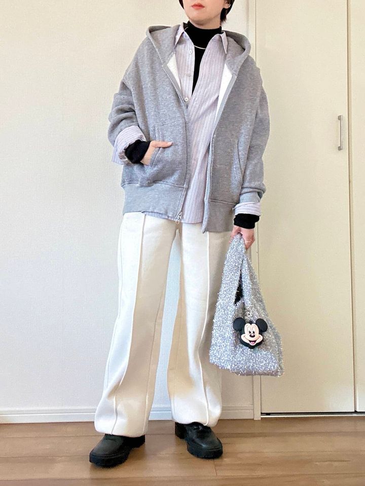 シャツとタートルネックニットのレイヤードは防寒対策も洒落感もきちんと感も叶えられる頼れる組み合わせ。その上にパーカーを羽織って、スウェット×スウェットコーデを楽しんでみましょう。旬なキラキラのラメバッグの合わせも、華やぎ感もアクセントもしっかりと効かせられるのでおすすめです。