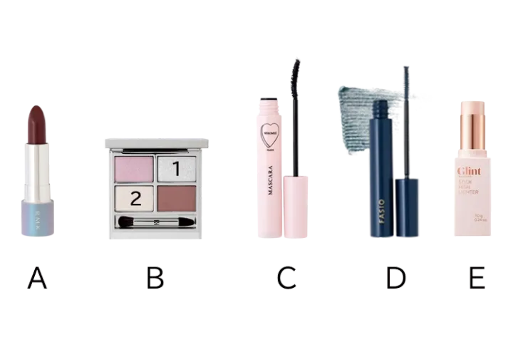 上下まつ毛にCを塗ったのち、Dを上まつ毛の目尻側の毛先にトッピング。Eを指で目の下全体に広くなじませる。