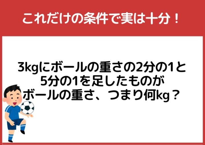 これだけの条件で実は十分!3kgにボールの重さの2分の1と5分の1を足したものがボールの重さ、つまり何kg?