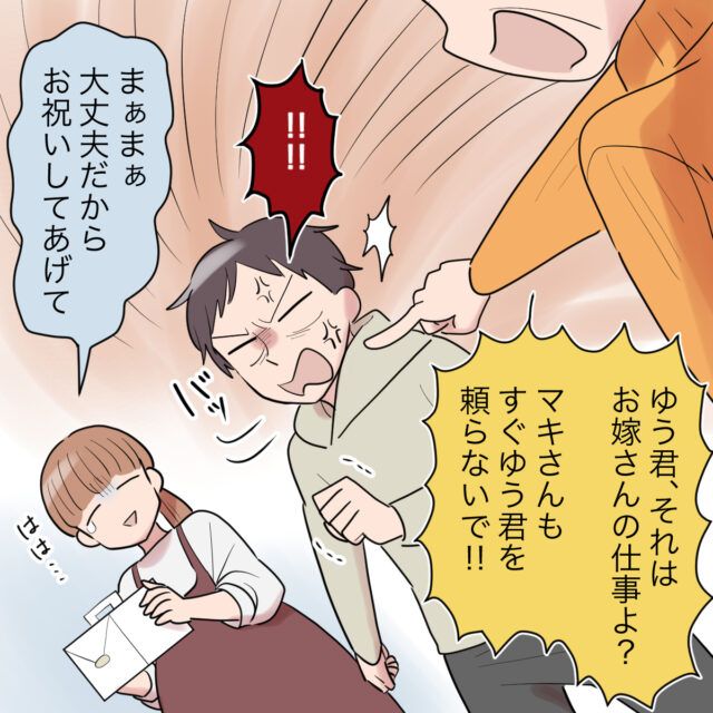 マキさんのイヤな予感は的中!「ゆうくん、それはお嫁さんの仕事よ?マキさんもすぐゆうくんを頼らないで!!」義母に注意されてしまいました。「!!」反抗しようと憤るゆうさんに、「まぁまぁ。大丈夫だからお祝いしてあげて。はは・・」半ば諦めたようにマキさんが言いました。