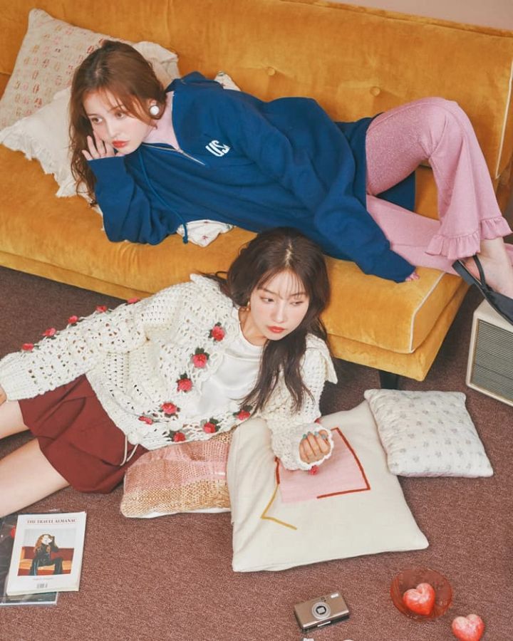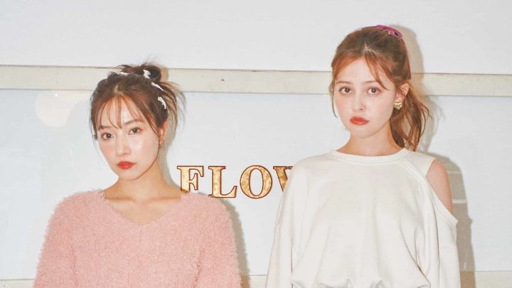 〈上・加藤〉ネイビーハーフジップパーカ 36,300円/チャンピオン 中に着たシアートップス 3,800円/Olu. フレアーパンツ 5,499円/W♥C イヤリング 12,960円/アビステ パンプス 参考商品/Silly by Lit’s〈下・村瀬〉お花つきニットカーディガン 12,100円/merry jenny サテントップス 12,100円/lilLilly(lilLilly TOKYO)ミニスカート 5,990円/ZARA(ザラ)イヤリング 9,450円/アビステ
