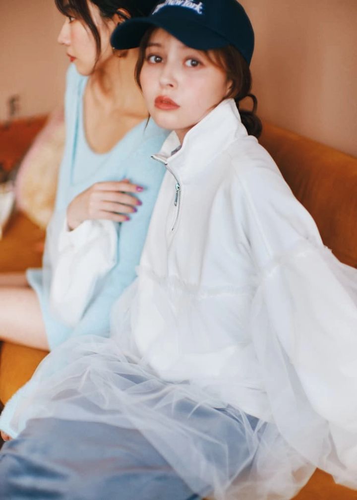 白チュールハーフジップスエットトップス 11,000円/merry jenny 中に着たシアートップス 1,690円/神戸レタス スカート 8,250円/RESEXXY キャップ 2,750円/スピンズ