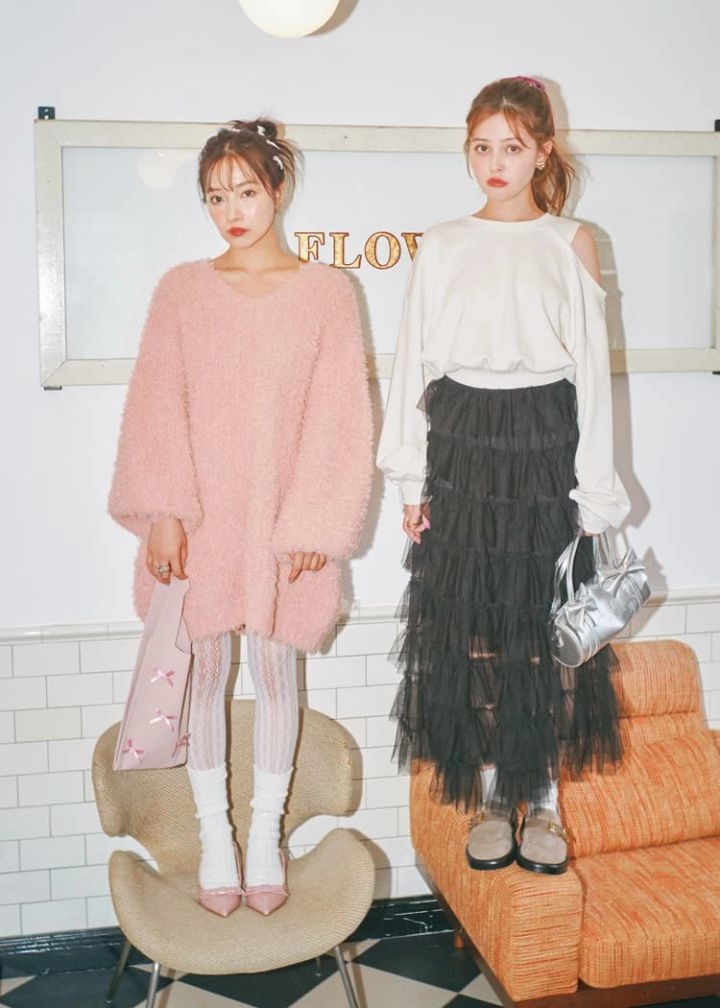 〈右・加藤〉オフ白ワンショルダースエットトップス 1,699円/GRL スカート 2,750円、バッグ 3,289円/ともにスピンズ ヘアピン 1,210円、イヤリング 2,530円、リング 1,980円/以上アネモネ(サンポークリエイト)靴下(3足セット)1,188円/チュチュアンナ ローファー 18,900円/チャールズ&キース(チャールズ&キース ジャパン)〈左・村瀬〉ピンクニットプルオーバー 11,000円/Darich(YSM)リング 3,300円/muku(アンティローザ)バッグ 3,300円/アネモネ(サンポークリエイト)タイツ 979円/チュチュアンナ ソックス 4,290円/ホイサム パンプス 6,590円/ZARA(ザラ)イヤリング、リボンヘアピン/ともにスタイリスト私物